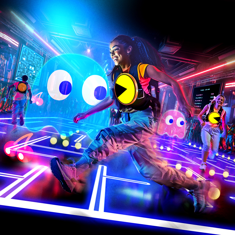 Enter a life-sized glowing maze, becoming PAC-MAN himself, dodging ghosts and chasing POWER PELLETS in an immersive world brought to life with projection mapping and tracking tech.